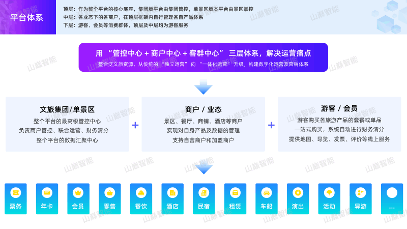 1.一体化架构,打破系统割裂壁垒:SaaS平台天然具备全域整合能力,山巅智能的一体化平台从架构设计上就实现了多景区、多商户、多业态的统一管控。通过一个管理后台、一套账户体系、一套数据体系,运营人员可完成所有业态的日常管理工作,无需在多系统间切换,大幅降低管理成本与操作门槛。这种架构**适配文旅行业“多业态融合”的发展趋势,为跨业态协作奠定基础。